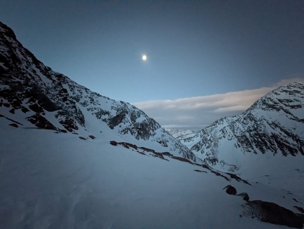 Это было очень круто. В течение ночи за укрытием постоянно слышался хруст – я сперва подумал что собака пришла в зимние горы на 3000 и ходит вокруг нас, но оказалось это слеживается снег.